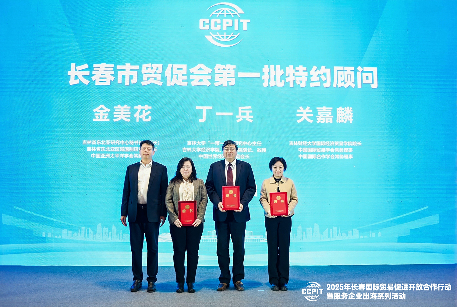 (圖3:陳德智向丁一兵、金美花和關(guān)嘉麟三位專家學(xué)者頒發(fā)長春市貿(mào)促會第一批特約顧問聘書)